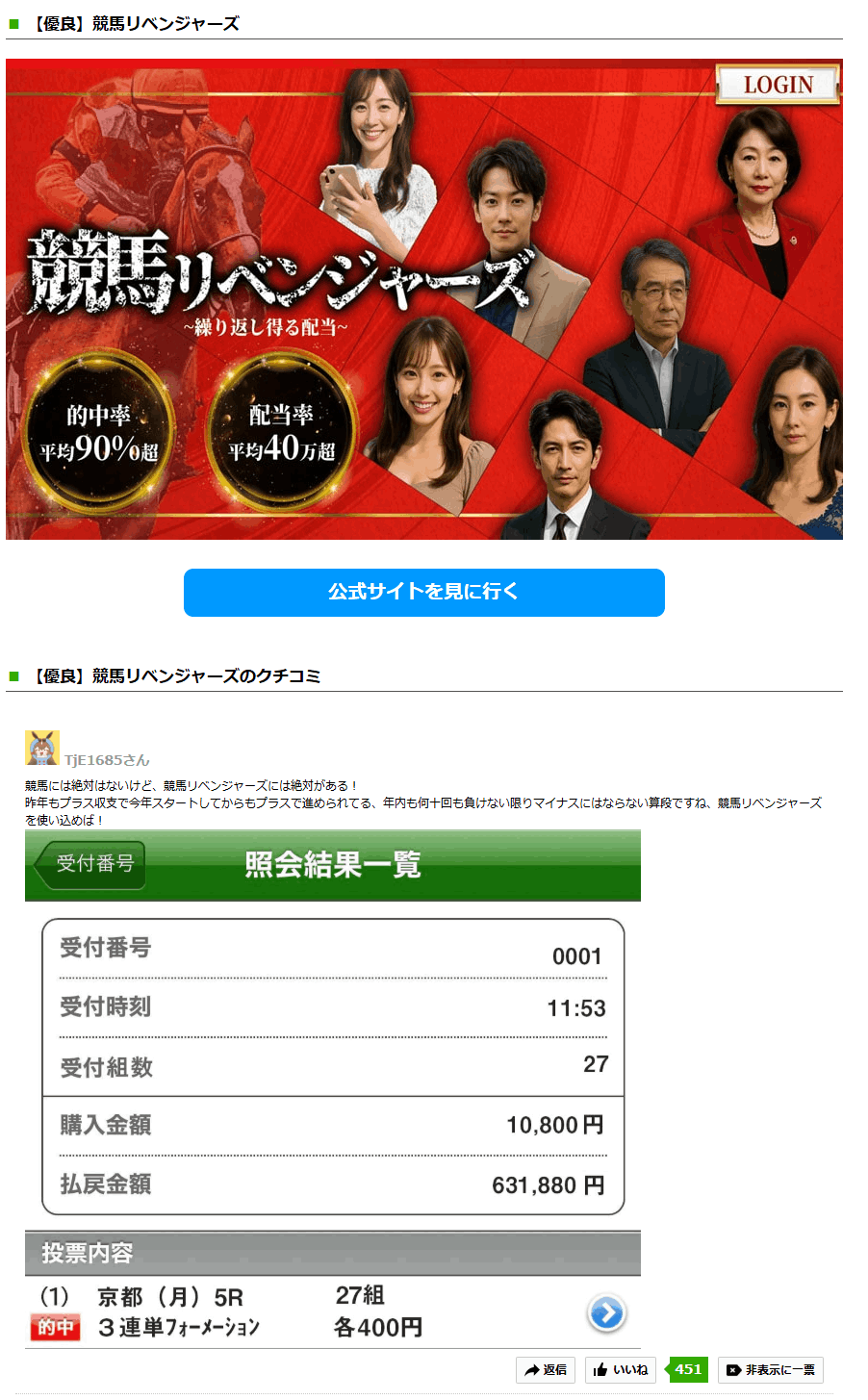 繰り返し得る配当をスローガンに平均的中率90%超、配当率、平均40万超と競馬攻略を牽引する「競馬リベンジャーズ」をご紹介、