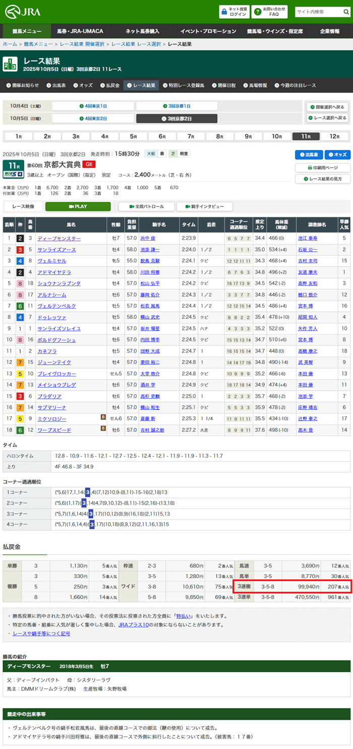 ディープモンスターはこの勢いを持って、秋の中距離路線で一角を担う可能性が高まりました。条件次第では天皇賞(秋)など上位クラスへの挑戦も視野に入るでしょう。今回の勝利が自信となれば、さらなる飛躍が期待されます。