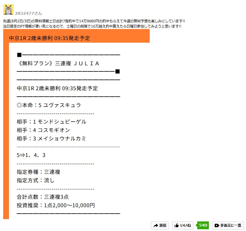 この的中を含め【8月16日(土)17日(日)】の無料情報は