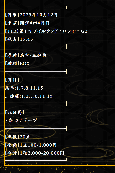 府中牝馬ステークスを引き継ぐ形の第一回アイルランドトロフィーを無料情報で3連単的中はお見事でした、全て推奨買い目、推奨馬券通り購入して 3連単 15-2-7 68,610円 229番人気 1点200円で137,220円払い戻し、馬券代引いても10万以上の利益でした、継続一択です。