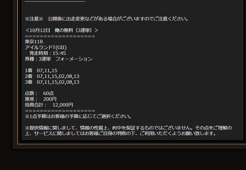 アイルランドトロフィー無料予想2-7-15的中! 実質この買い目で3連単も当たっていたけど、無料情報と有料情報の差は配当部分にあるんだろうな。 3連複でも推奨通り馬券買ったから9万1000円払い戻しで大きすぎる的中! 三日間開催最終日も予想出るかな?3連休で休みだから出してほしー!