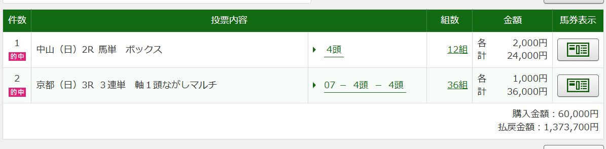 1点500円で馬券買っていたから一撃18万4800円獲得、地味に荒れたから的中嬉しすぎます。