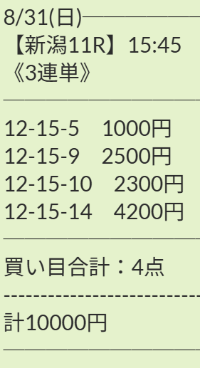新潟記念、買い目見た時に人気→人気→ヒモ荒れ予想だと一目で分かりました。