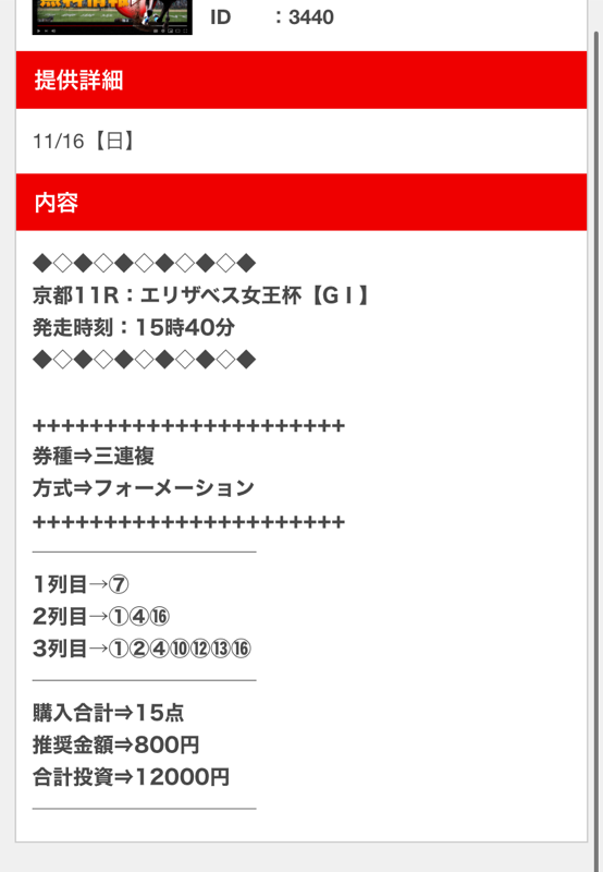 穴馬ch25の11月16日のG1エリ女無料予想3連複89.2倍×800円的中で7万1360円払い戻し貰えました! 1着2着3着フォーメーション通りに3連単買っていても的中だった買い目です、1点100円でも買っておけば万馬券的中でした、凄い予想です!