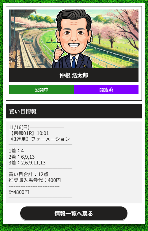 中々の的中率ですね、有馬記念まで突っ走って的中ラッシュお願いします