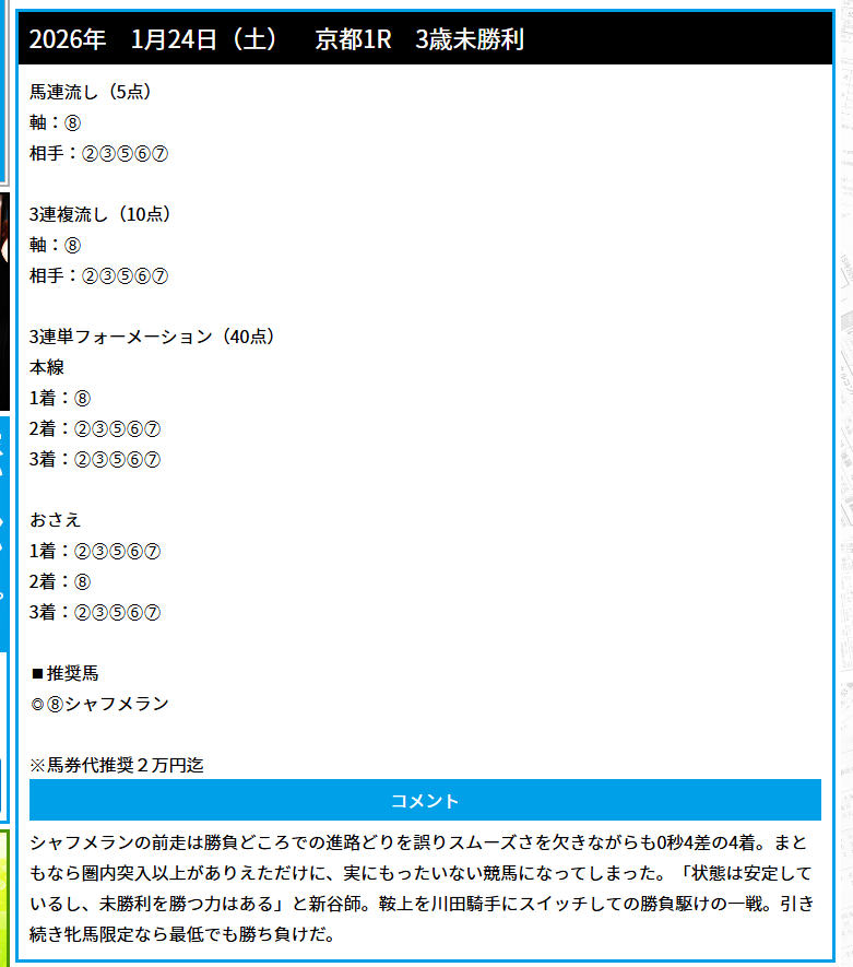 配当狙って3連単1点狙いで無料予想使って正解でしたわ! 馬券代2万円推奨だったので1点500円点数40点で2万円に合わせて利用しました。結果は馬連も3連複も3連単も当たり、唯一馬券買っていた3連単のオッズは317.4倍も付いてくれたおかげで馬券代2万がかすみますね!!! 推奨通りの購入で15万8700円払い戻しでした、朝一発目のレースからこんな的中もらえると痺れますね!